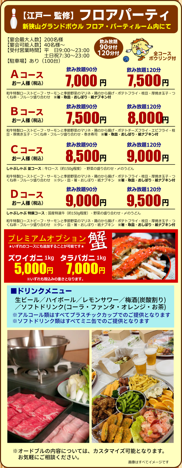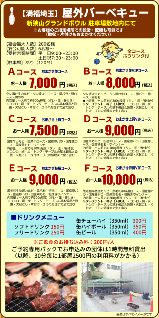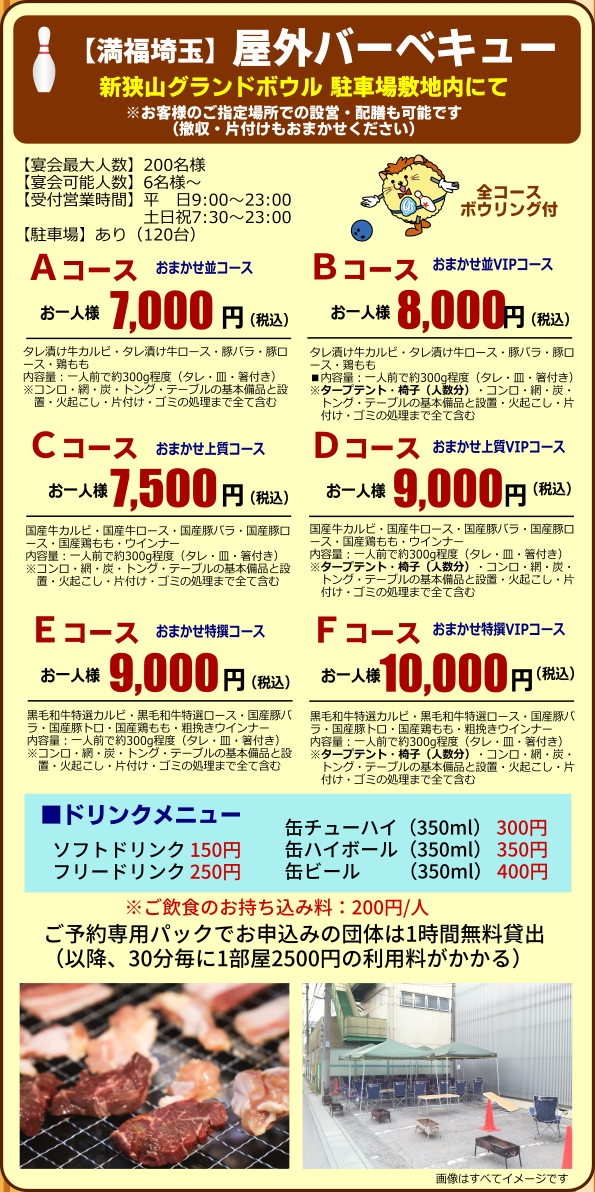 屋外BBQや屋内パーティのプランです(すべてボウリング2ゲーム&貸靴付)