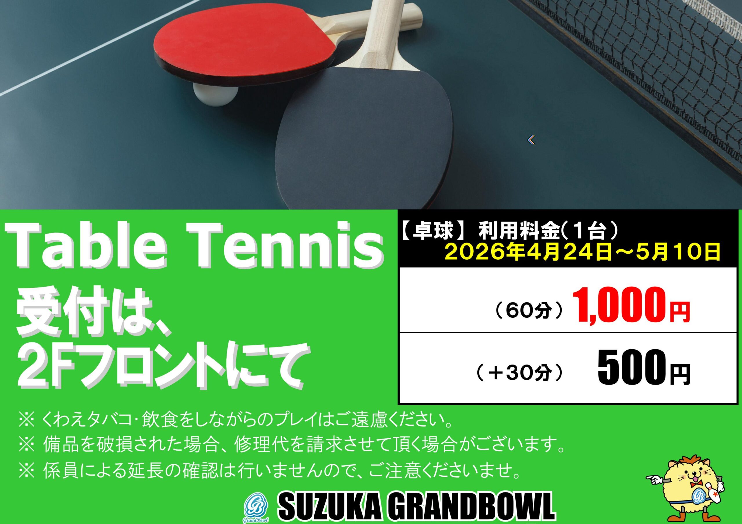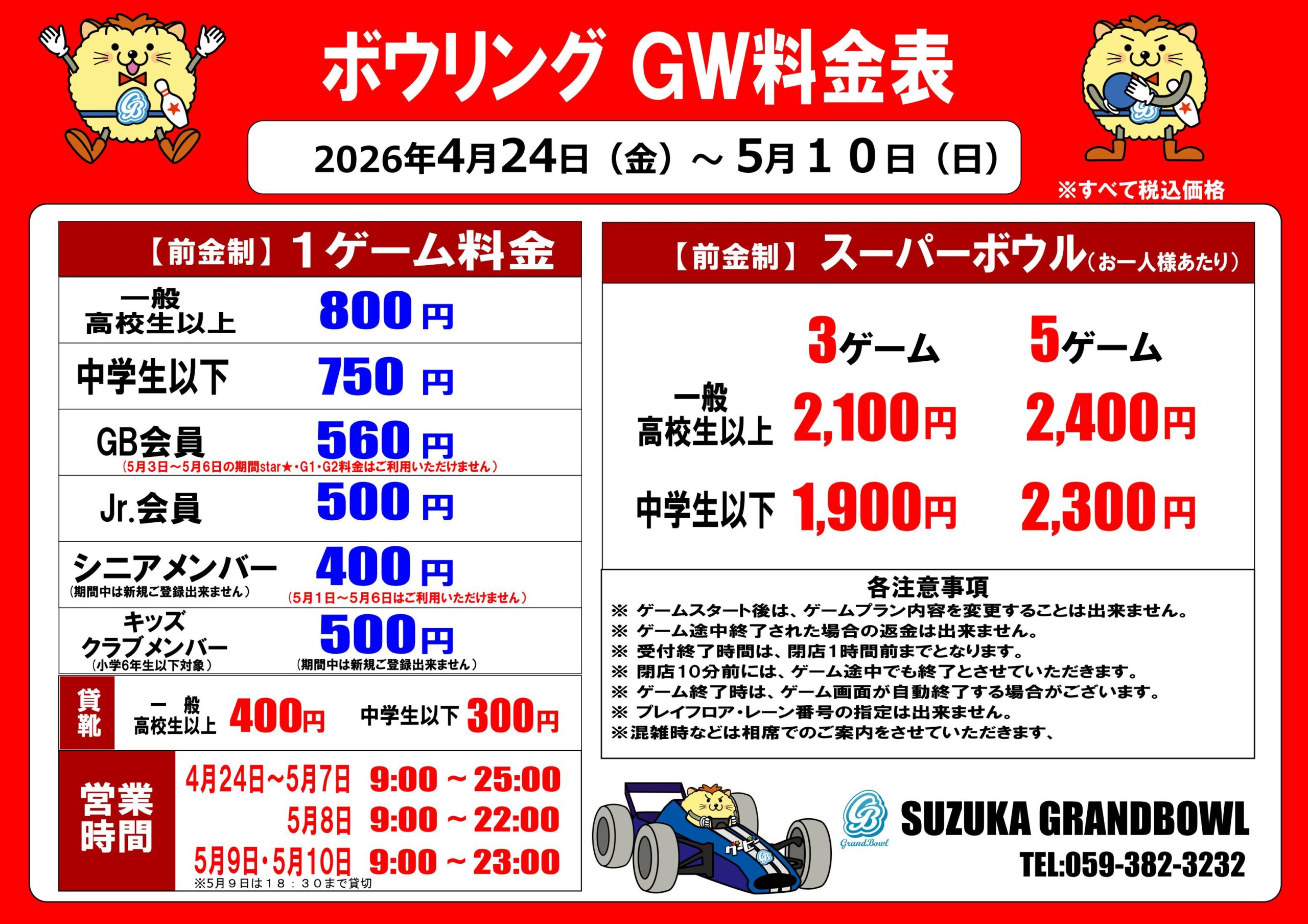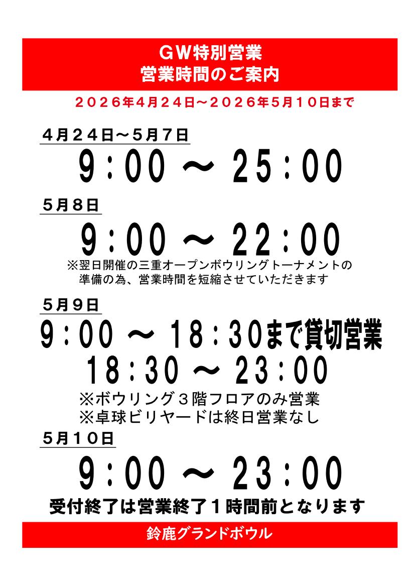 4月24日から5月10日まで特別営業期間となります。営業時間や価格が普段と変わりますのでご注意ください。