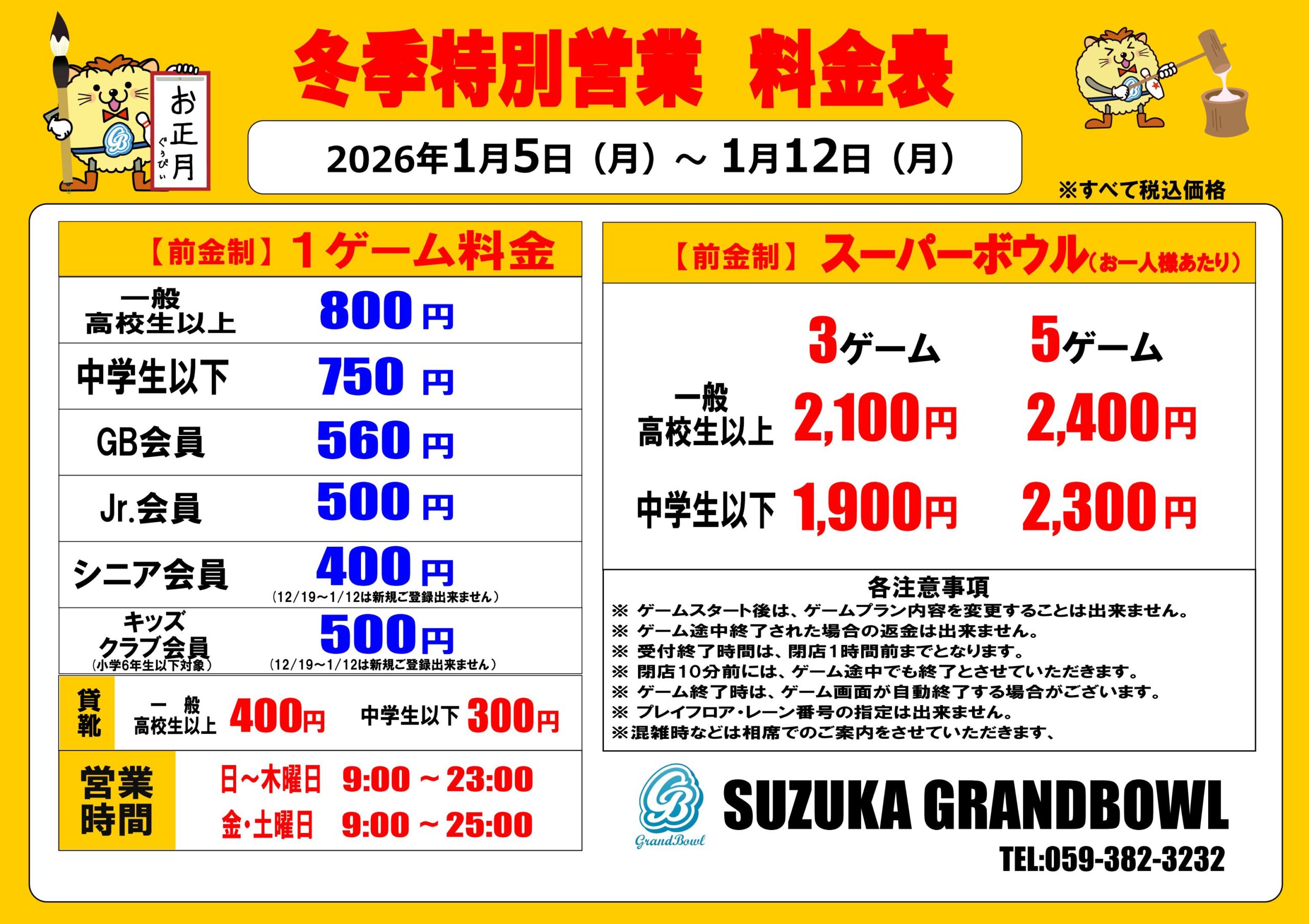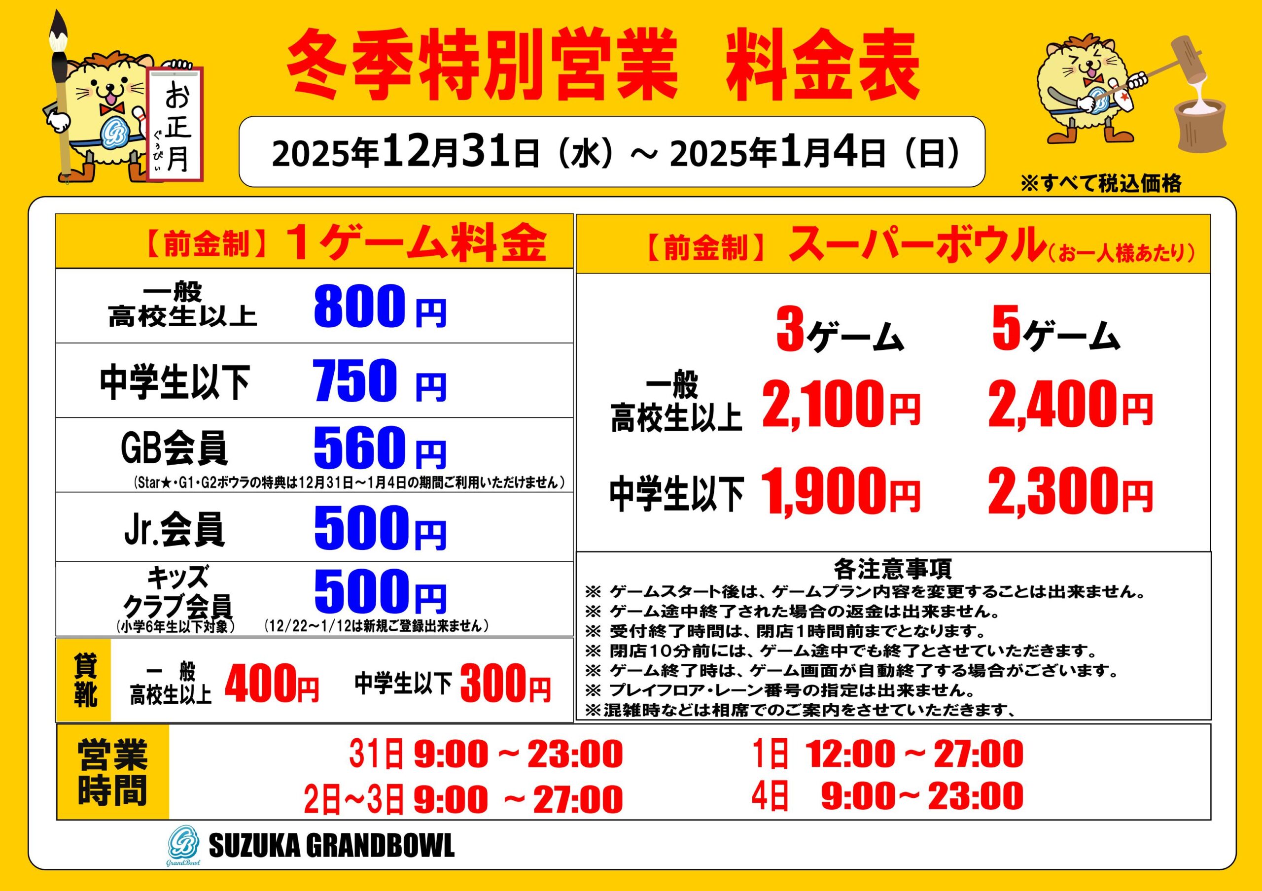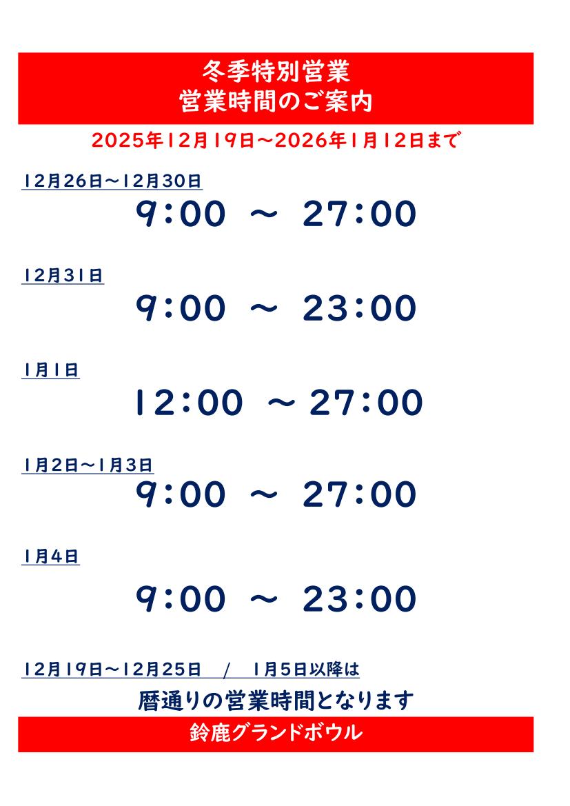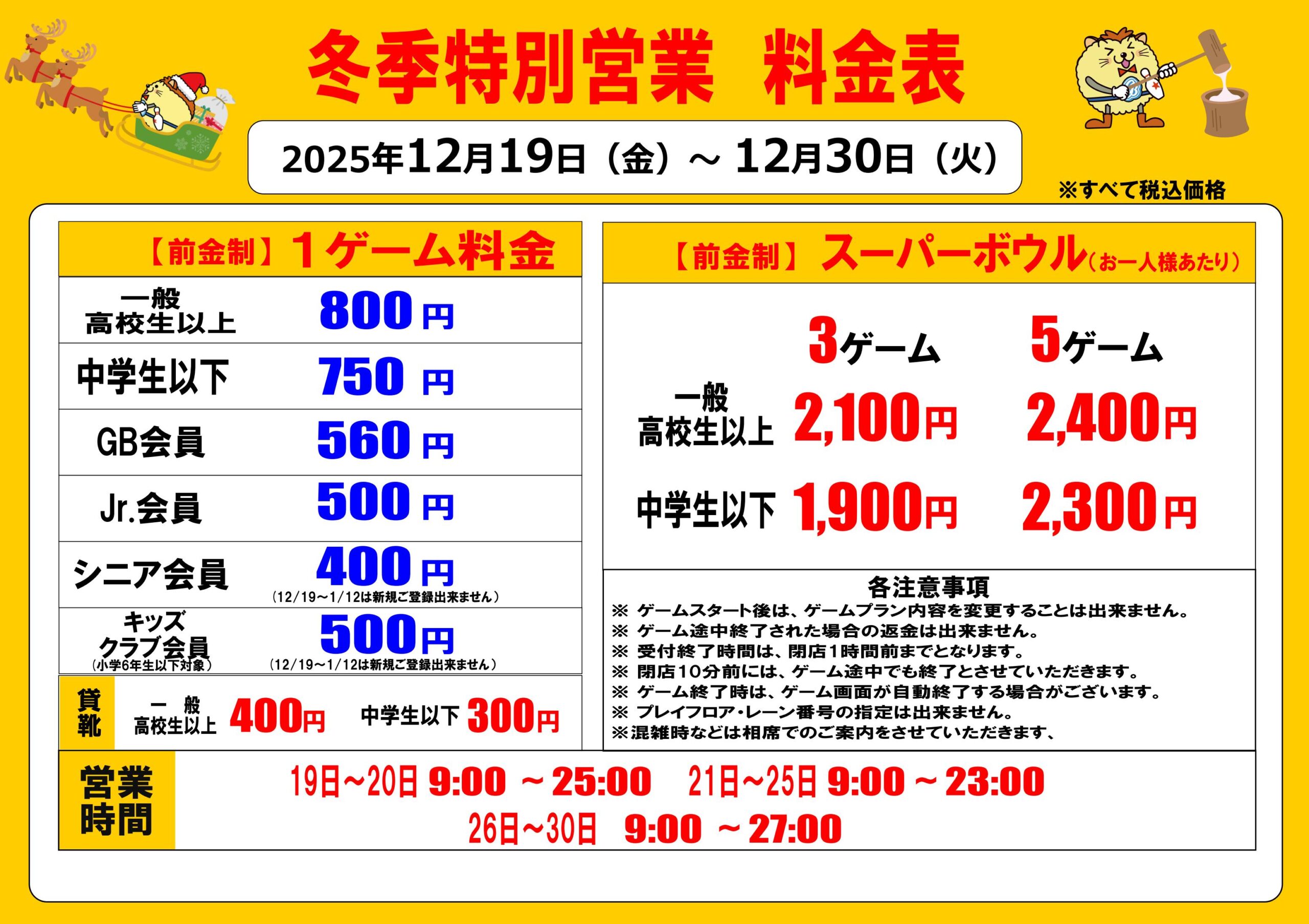 2025年12月19日~2026年1月12日までの期間を冬季特別営業期間とし、下記に掲載いたしました営業時間、料金となります。
