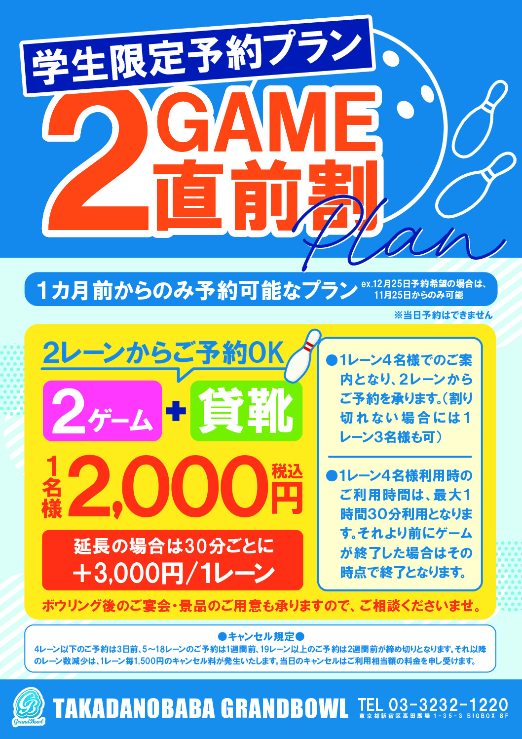 学生限定!!直前予約割プランはじめました。 | 高田馬場グランドボウル MENU